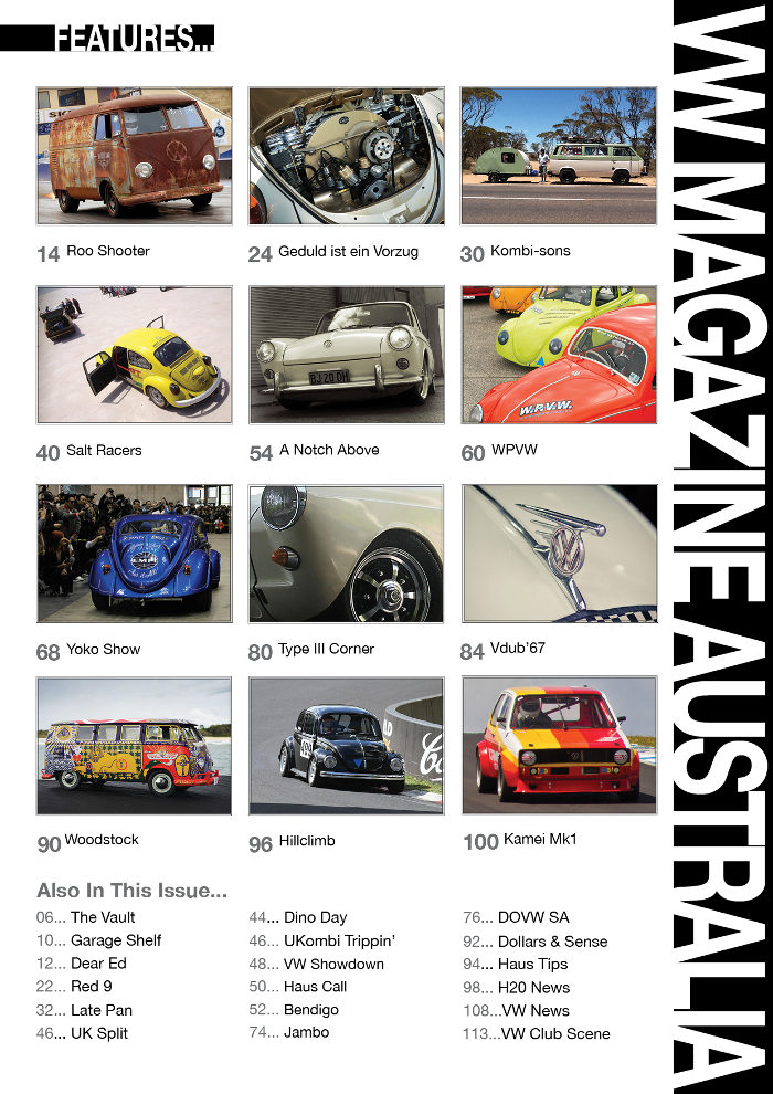 VWMA is an Australian owned and published enthusiasts magazine serving both the aircooled and watercooled Volkswagen scene nationally. Published quarterly (Feb, May, Aug, Nov), the magazine is available through newsagents Australia wide or via subscription, and covers every aspect of the hobby, from the very early models through to the latest innovations, motorsport, offroad, kit, custom, books, toys and shows. If it doesn't appear in VWMA then it isn't VW related.